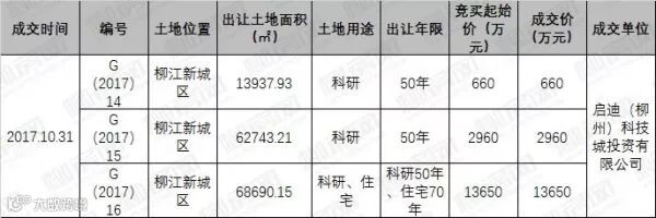 当天拿地总面积145371.29㎡(合218.06亩),分三个地块构成,其中两块地为科研用地,一块为科研住宅混合用地,三地块均由启迪(柳州)科技城投资有限公司以总价17270万元竞得,单亩地价79.2万元/亩,三地块折后楼面地价531.24元/㎡。