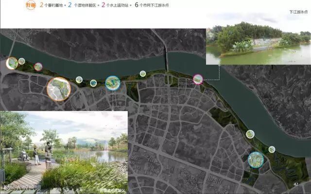 湿地公园还将沿岸打造2个垂钓基地、2个湿地体验区、2个水上运动站、6 个市民下江游泳点、2片休闲运动区域、5个沿江观景点和2个观江制高点,包括还原柳江历史江岸风貌的彩石滩、引入大量柳江水体的官塘湿地体验园等等。
