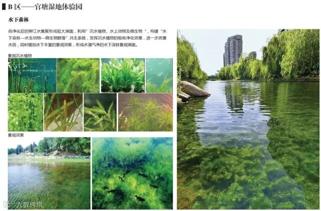 官塘湿地体验园的水下森林十分新颖,经过层层净化的柳江水在湿地体验园最后集聚成较大的湖面,湖水比江水更加清澈,成为湿地公园绝佳的展示窗口,湖底的沉水净化植物形成一道靓丽的景观,也就是水下森林景观,为湿地公园带来新的景观体验。