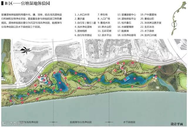 湿地公园一方面将充分利用对岸莲花山、高帽岭和东南方古亭山的山景资源,一方面将充分做足自身的湿地水文章,强调两岸互动,突出山水景观特征。