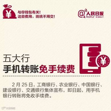 中国工商银行、中国农业银行、中国银行、中国建设银行、交通银行五家银行联合宣布,即日起,陆续对客户通过手机银行办理的转账、汇款业务,无论跨行或异地都免收手续费。