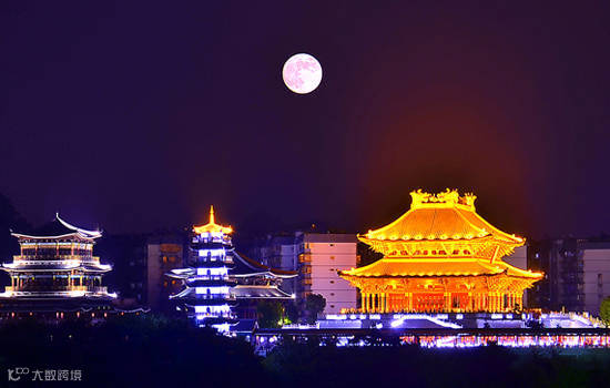 华灯初上,天上的月亮和江面粼粼波光交相辉映,仿佛海市蜃楼,恰似人间天堂。