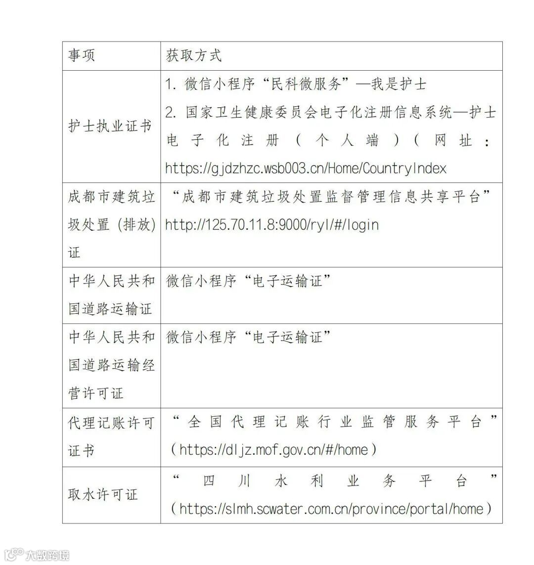 具体而言,办事群众获取护士执业证书电子证照,可进入微信小程序“民科微服务”或国家卫生健康委员会电子化注册信息系统;获取中华人民共和国道路运输证、中华人民共和国道路运输经营许可证,可进入微信小程序“电子运输证”;获取代理记账许可证书,可上网登录“全国代理记账行业监管服务平台”;获取成都市建筑垃圾处置(排放)证,可上网登录“成都市建筑垃圾处置监督管理信息共享平台”;获取取水许可证,可上网登录“四川水利业务平台”。