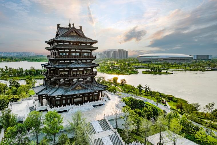 成都东安阁酒店位于龙泉驿东安湖公园,与世界大运会主场馆隔湖相望,项目采用中国园林式建筑布局,主要功能为国际文化交流中心、会务、接待、展览、住宿等,拥有约750平方米宴会厅,125平方米的会见厅以及三间45-127平方米不等的会议室,88间舒适客房。酒店建筑在南北轴线上点缀会见厅、戏台、休闲亭、水榭、望锦亭等仿古建筑,与东安阁楼形制相呼应。建筑风貌以简约现代中式风格为主,整体群落具有灵动而不失典雅,朴素而不乏精致的现代之美。