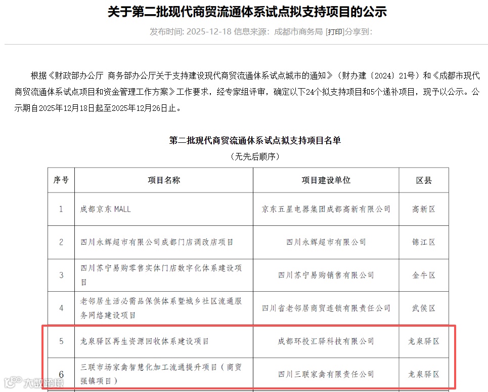 两大项目分别以智慧回收畅通城市“静脉”、以数字冷链守护市民“餐桌”,锚定智能、绿色、标准化方向且兼具可复制性,既彰显成都高质量发展与超大城市治理的创新实践,更体现龙泉驿区落实“双碳”、建设“无废城市”的坚定决心,实现城市绿色循环与民生保供安全协同布局,为成都公园城市示范区建设注入强劲动力。