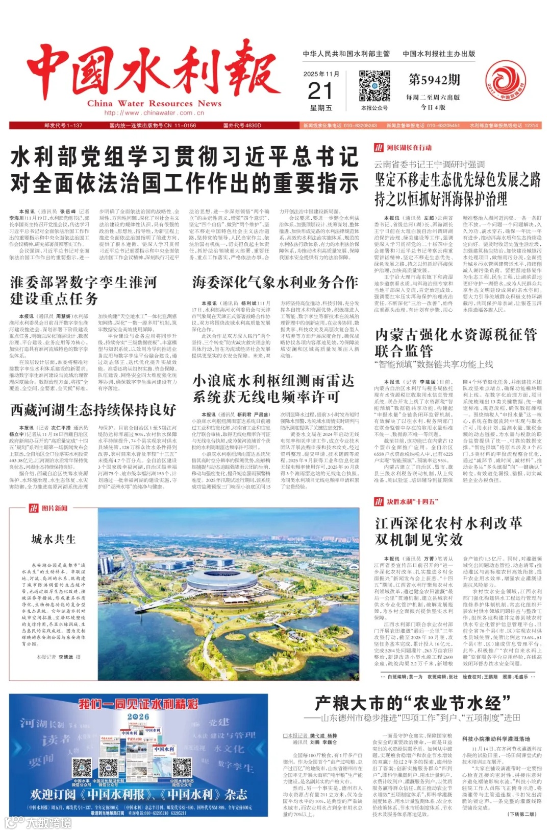 《中国水利报》头版报道东安湖公园,