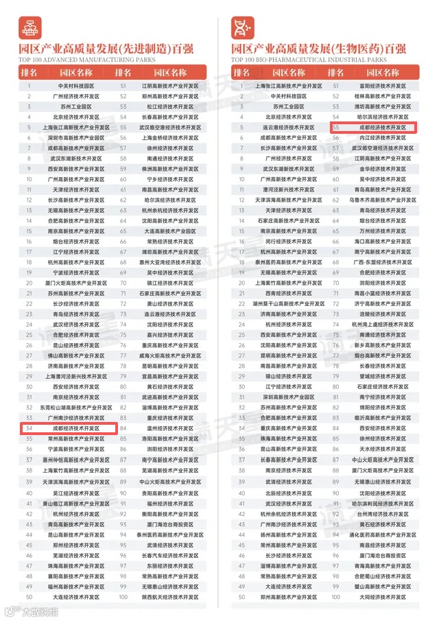 研究发现,做强优势产业集群成为园区高质量发展的重要趋势。先进制造业百强园区中,得益于先进制造业集群和中小企业特色集群的打造,园区先进制造业集聚度持续上升,产业上下游企业协作紧密,行业龙头发挥其技术、创新和行业影响力优势带动中小企业加速向专精特新、智能制造转型,是位次跃升的关键因素。在这一榜单当中,成都经开区位居第34位。