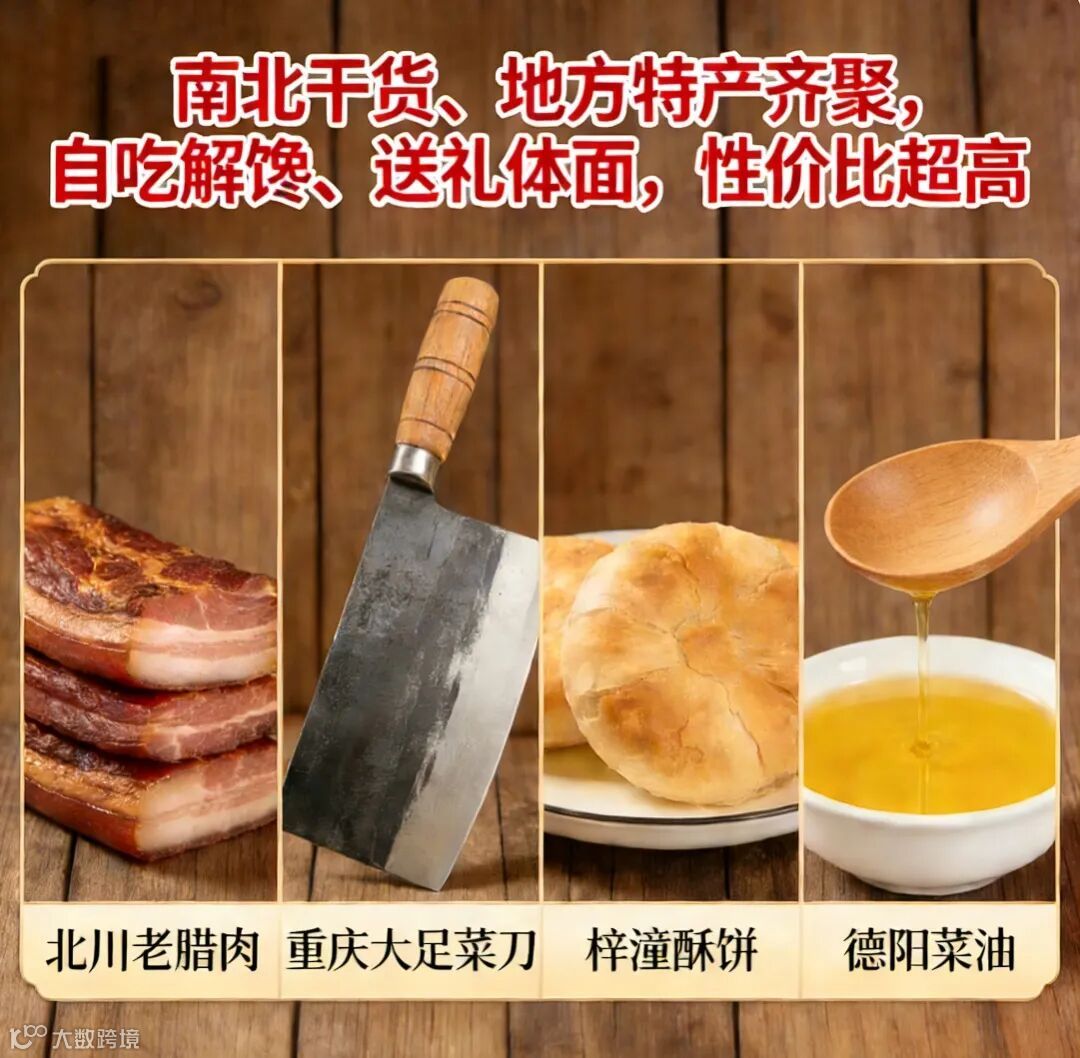 北川老腊肉、重庆大足菜刀、梓潼酥饼、德阳菜油、彭州九尺板鸭、新疆核桃、文山三七等南北干货、地方特产齐聚,自吃解馋、送礼体面,性价比超高。