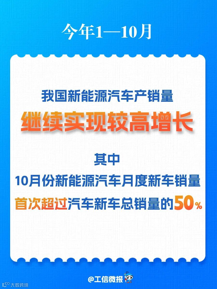 中国汽车工业协会11日发布的最新数据显示,今年1至10月份,我国新能源汽车产销量继续实现较高增长。其中,10月份新能源汽车月度新车销量首次超过了汽车新车总销量的50%。