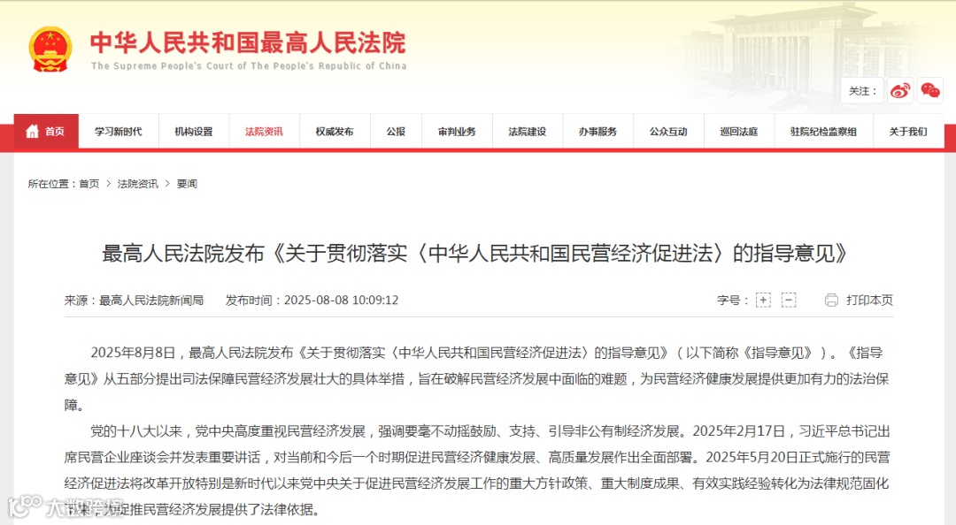 为充分发挥审判职能作用,推动民营经济促进法精神内涵、基本理念和相关规则融入人民法院工作的全过程、各环节,《指导意见》全面总结人民法院审判执行工作实际,进一步细化裁判规则,健全完善工作机制,致力解决实际问题,确保法律正确实施、统一适用,从总体要求、依法平等对待、引导守法规范经营、严格公正司法、健全公正司法体制机制等五个方面,提出了深入贯彻落实民营经济促进法、促进民营经济健康发展的25条意见。(意见原文)