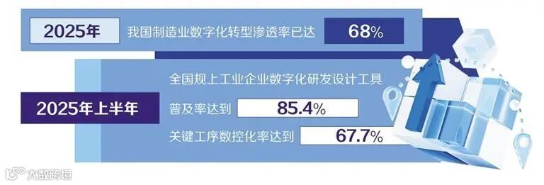 赵刚介绍,我国制造业数字化加快普及。2025年,我国制造业数字化转型渗透率已达68%。2025年上半年,全国规上工业企业数字化研发设计工具普及率达到85.4%、关键工序数控化率达到67.7%。