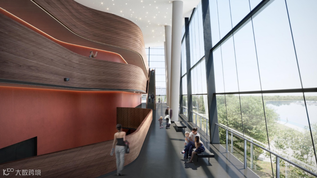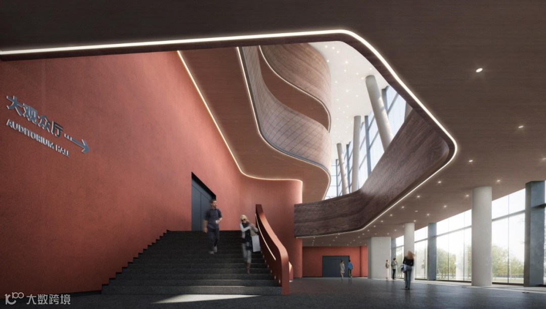 作为龙泉驿区文化艺术事业的重要一环,以风帆为造型的东安湖大剧院在设计上也别具匠心。剧院墙壁以红色肌理涂料为主色调,并配有木纹栏板、仿清水混凝土柱子等,让整个建筑内部看上去十分典雅。其入口处设计主题为“星河流韵”,以“满天星”的造型构思与极富动感的室内线条,让观众一进入剧院就会有丰富的观感体验;沿湖设置的大观众厅入口与顶部空间贯通为一体,以“洞窥星月”为灵感,为观众营造丰富的空间体验;休息厅的多标高观景平台可以把东安湖景色尽收眼底。