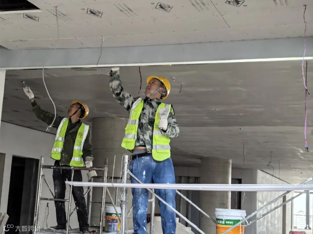 进入到大厅内部,5盏施工强光照明灯照向中央,头顶,密密麻麻的龙骨错落有致,工人们正忙着搬运材料、安装龙骨。“这个地方就是以后大剧院的观众席上面了。”蒋武维介绍,这里正在进行曲面吊顶的龙骨基础施工,目前这部分工作已经完成了80%左右,待完成后,将快速转换到下一道工序。