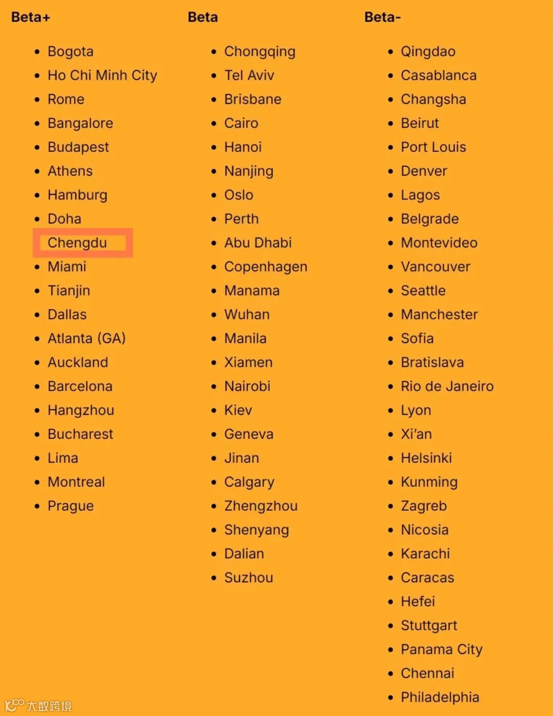 10月30日,最新排名公布,成都较上期排名提升了13个位次,在Beta+行列。