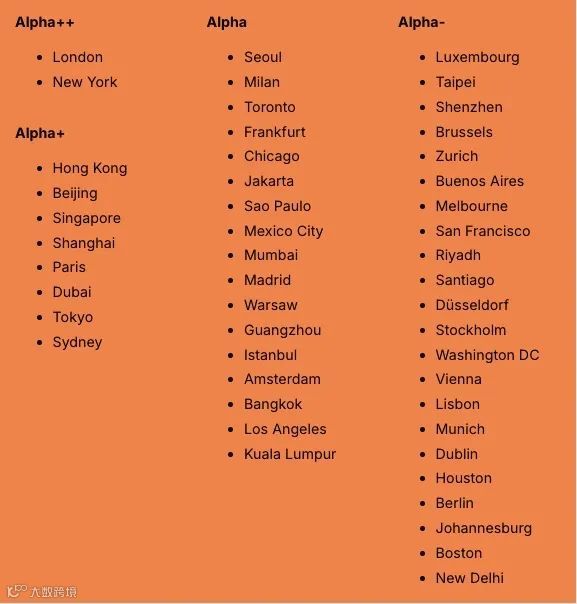 在这份榜单上,城市被划分为Alpha,Beta,Gamma,Sufficiency(+/-)四个等级(即:全球一二三四线),以表明不同城市在全球化经济中的位置及融入度。