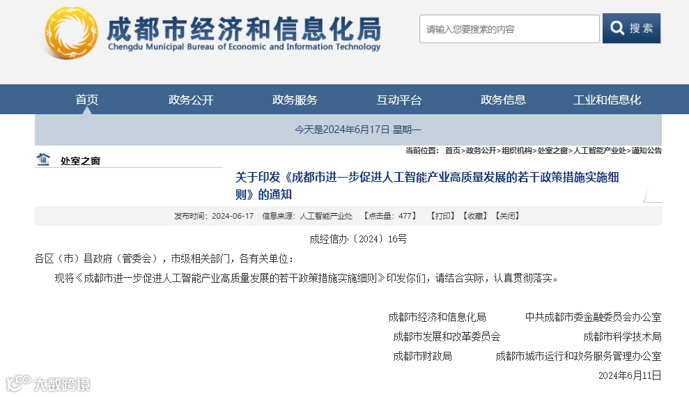 据成都市经信局市新经济委官网消息,《成都市进一步促进人工智能产业高质量发展的若干政策措施实施细则》已于近日印发。《实施细则》从支持算法工具源头创新、支持算法创新转化、支持算法首试首用、支持建设创新应用平台、支持企业发展壮大、支持企业上市融资、支持企业集聚发展、支持高端要素聚集化、支持开展标准研制九个方面给出具体政策措施,推进政策高效落地,促进人工智能产业高质量发展。