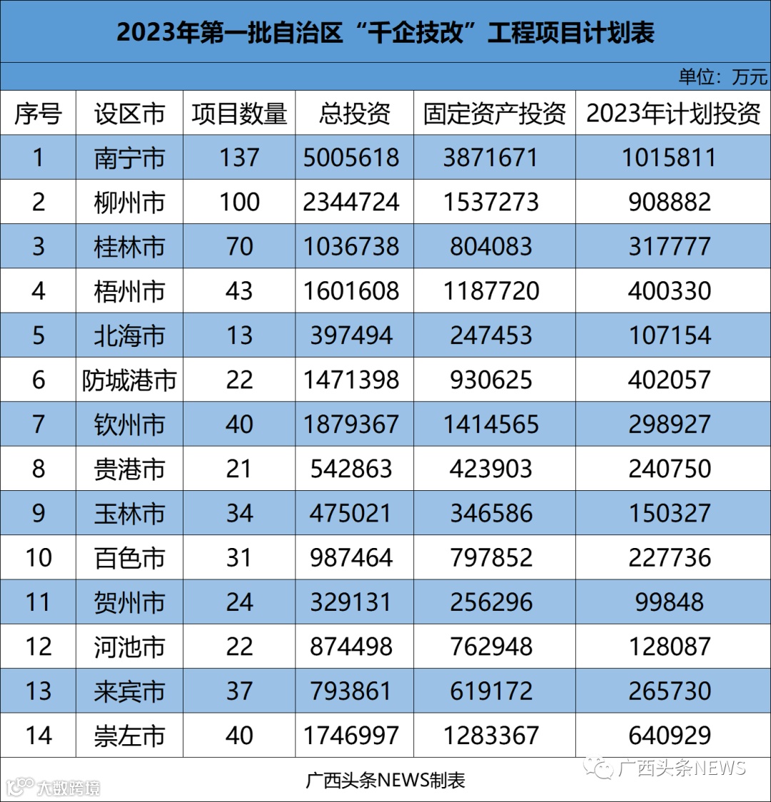 2023年第一批自治区“千企技改”工程项目计划中,柳州有100个项目上榜,总投资234亿元,2023年计划投资98亿元。