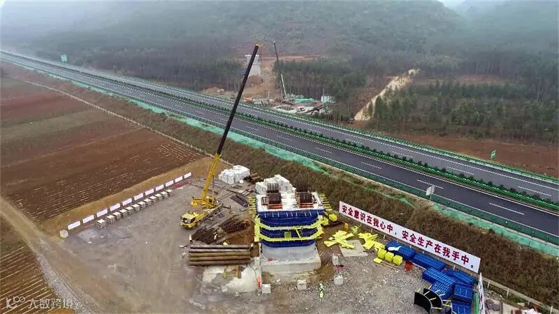 在贯村垮象来高速特大桥施工现场,项目首个跨高速连续梁也完成了两个主墩的混凝土浇筑。