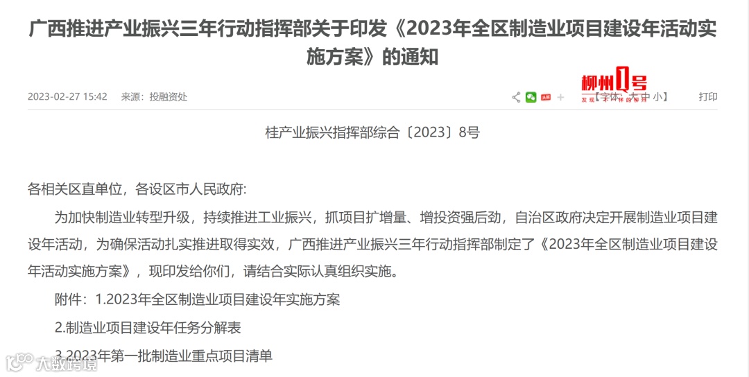我市一批工业项目又迎政策利好,为强后劲提供了坚强保障。日前,广西推进产业振兴三年行动指挥部印发《2023年第一批制造业重点项目清单》,柳州共有107个项目位列其中,为全区获列入项目最多的城市。