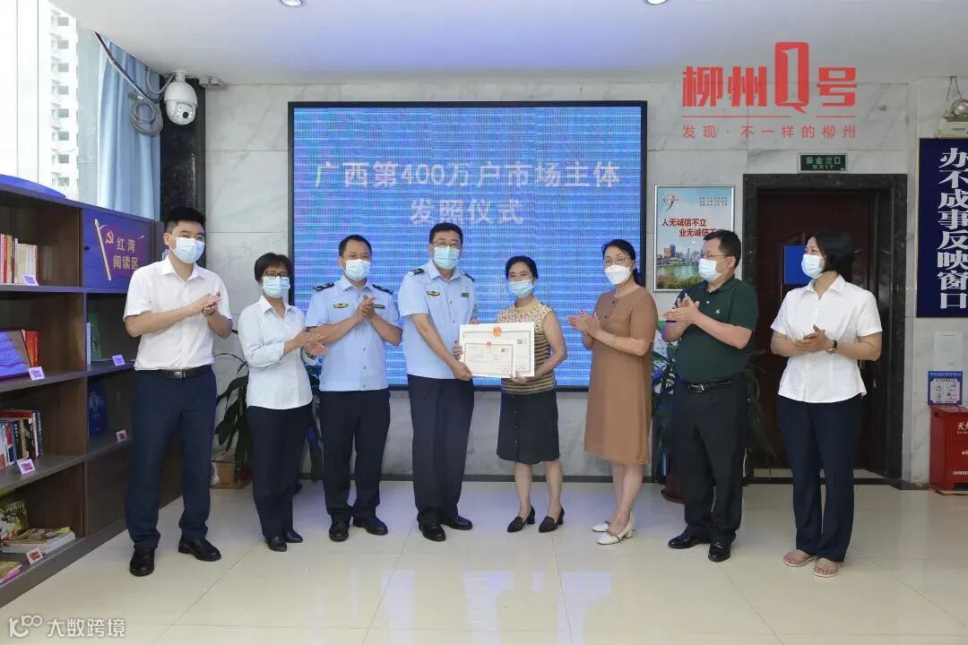 “从取得营业执照和公章,到办税开票和银行、社保、医保、公积金开户,完成这7个环节仅需半天时间,优化营商环境的‘柳州速度’让企业发展信心满满。”6月1日,怀揣着鱼峰区政务服务中心工作人员发放的广西第400万户市场主体营业执照,市幸福乐养老服务有限公司负责人韦女士高兴地说。