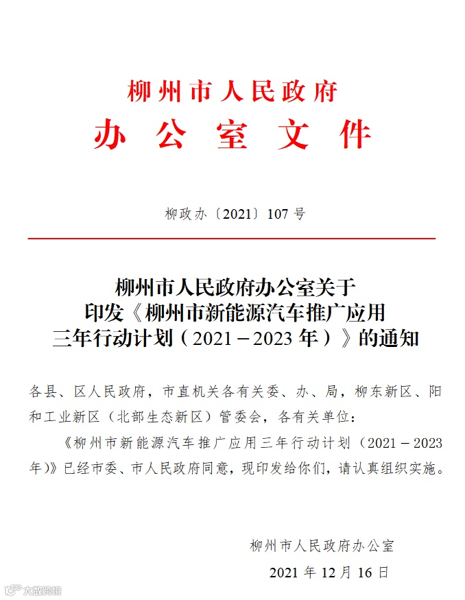 12月16日,市政府印发《柳州市新能源汽车推广应用三年行动计划(2021-2023年)》(简称《计划》),《计划》提到,深入推进新能源公交车替代传统燃油公交车,实现新增公交车辆电动化率达到100%;在农村客运班线逐步推广使用新能源汽车,确保2023年底农村客运班线新能源客车应用率超过70%。