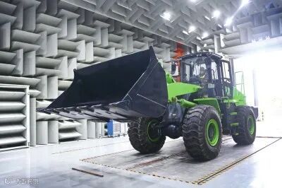 在柳工半消声实验室(NVH)里,研发人员对电动装载机进行噪声等相关测试。黎寒池 摄