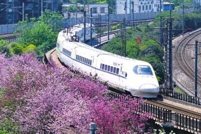 广西柳州,动车组列车在花海中穿行。黎寒池 摄
