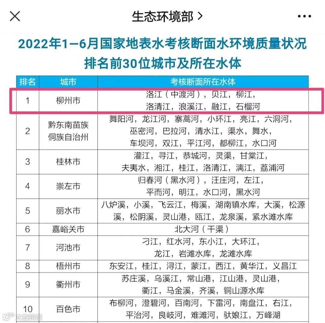 7月18日下午,生态环境部公布了2022年1—6月全国地表水环境质量状况。柳州在地级及以上城市国家地表水考核断面排名中,位居第一名。