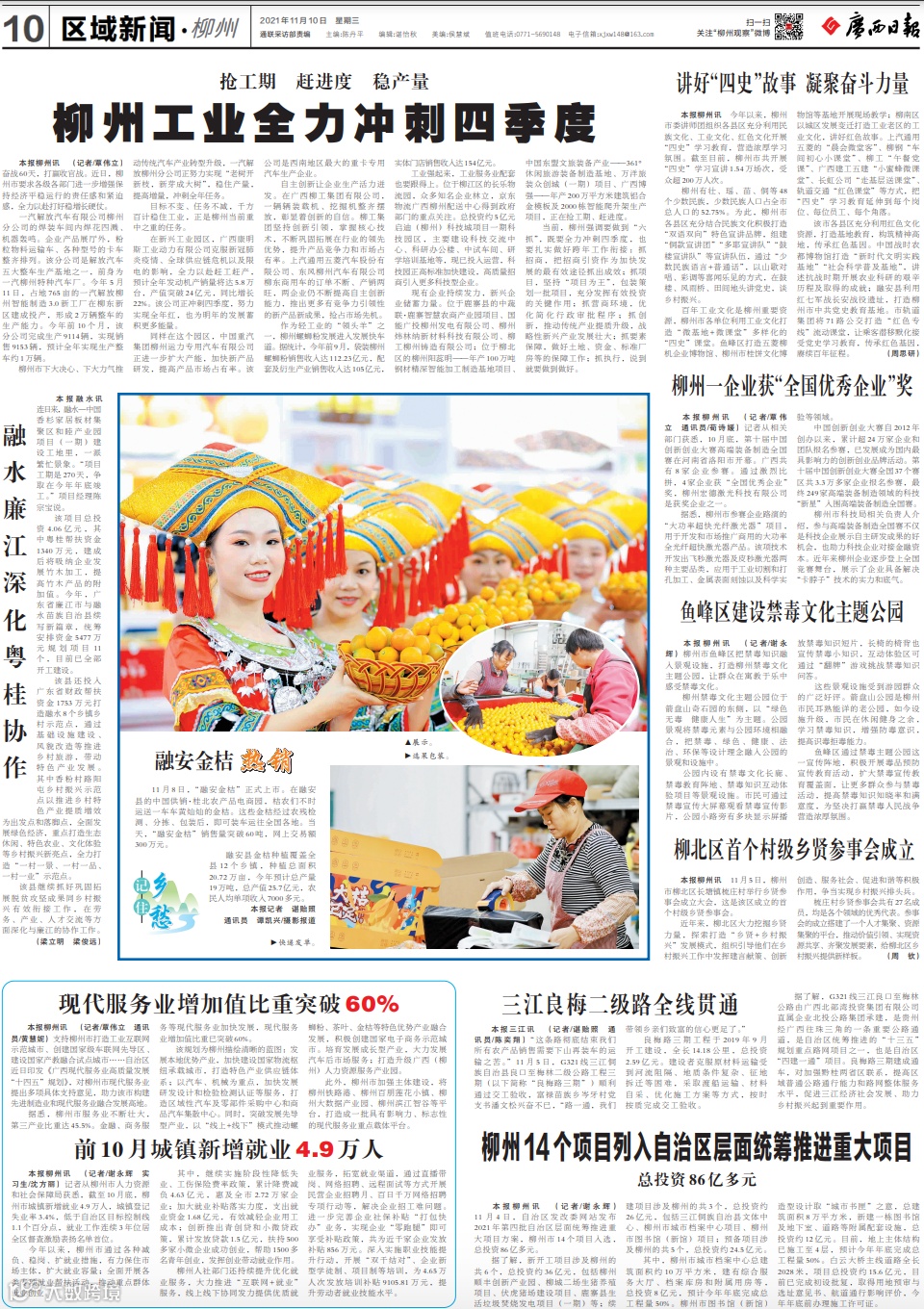 11月10日,《广西日报》区域新闻版整版报道柳州。其中头条刊发《抢工期 赶进度 稳产量!柳州工业全力冲刺四季度》。报道称,柳州市要求各级各部门进一步增强保持经济平稳运行的责任感和紧迫感,全力以赴打好稳增长硬仗。