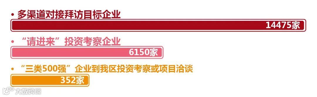 多渠道对接拜访目标企业14475家,“请进来”投资考察企业6150家,推动国华能源、北京百度、奥特莱斯(中国)、新奥集团等352家“三类500强”企业到我区投资考察或项目洽谈。