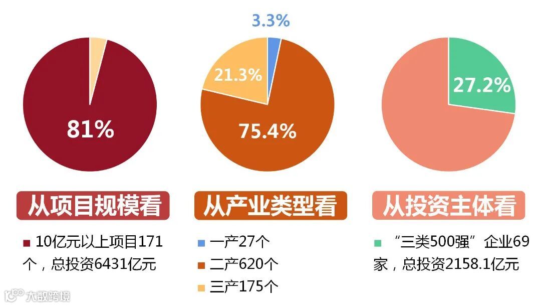 其中,10亿元以上项目171个,总投资6431亿元、占比81%;一产27个、占比3.3%,二产620个、占比75.4%,三产175个、占比21.3%;“三类500强”企业69家,总投资2158.1亿元、占比27.2%。