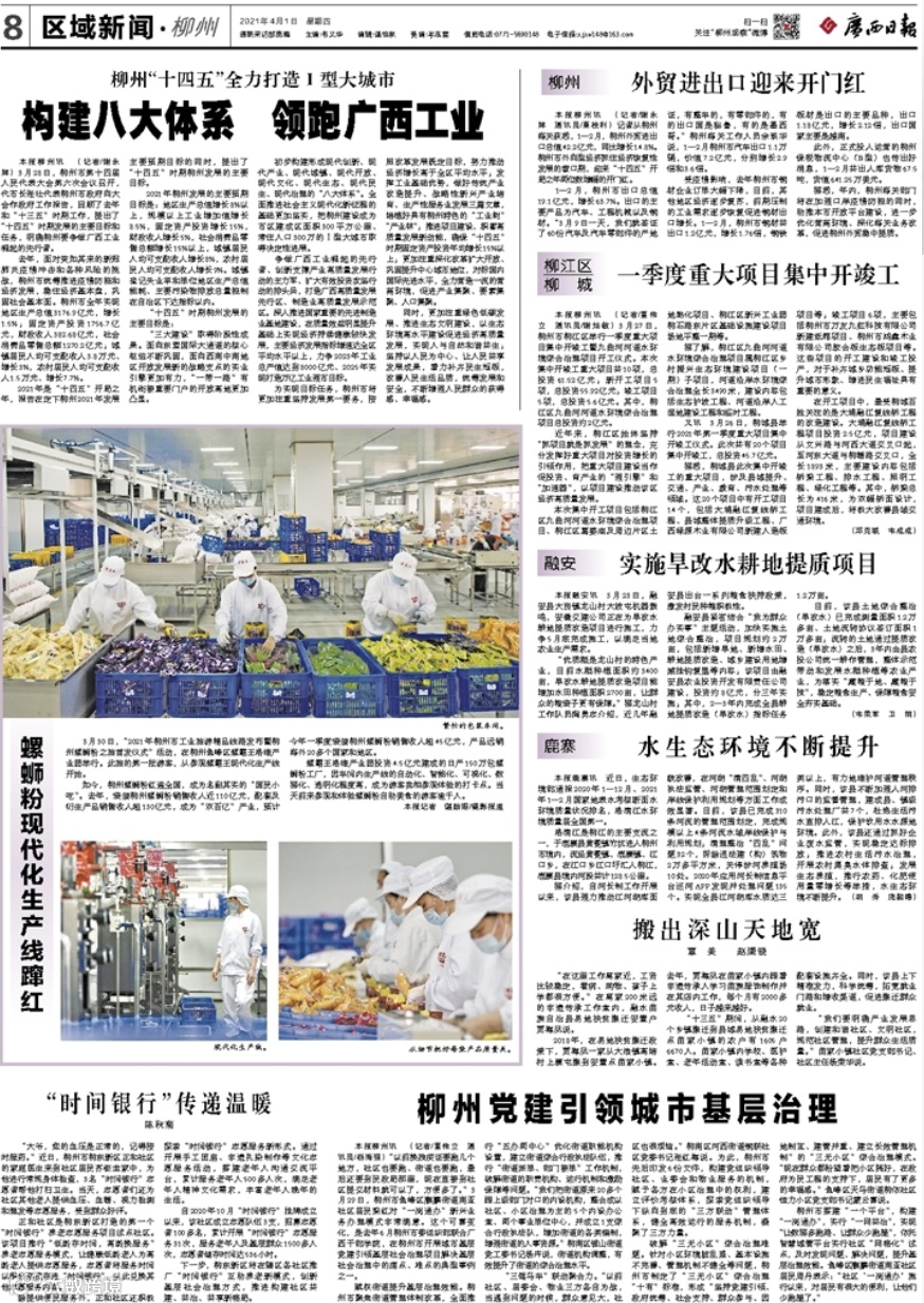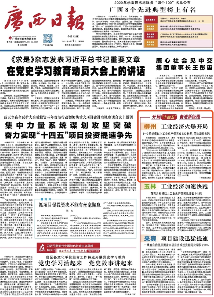 4月1日,《广西日报》头版刊发《柳州:工业经济火爆开局》。报道称,据初步统计,今年1—2月该市规模以上工业总产值完成622亿元,同比增长55%。其中2月完成252亿元,同比增长104%。