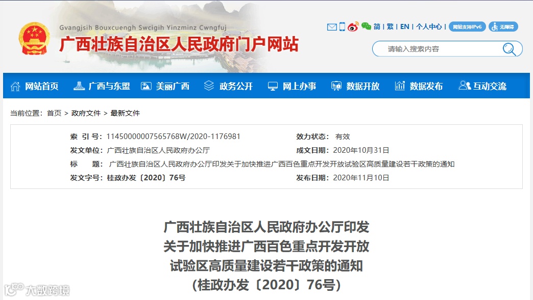 通知指出,为加快将广西百色重点开发开放试验区(以下简称试验区)建设成为我国与东盟高质量共建“一带一路”的重要平台、辐射带动周边经济发展的重要引擎、稳边安边兴边模范区、生态文明建设示范区,政策上将全面鼓励先行先试,赋予自治区级审批权限,并全力打造一流营商环境。