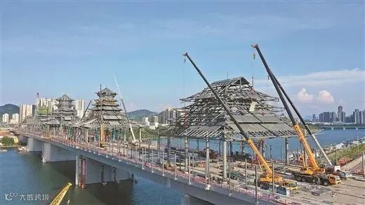 8月22日,工人在柳州市凤凰岭大桥桥面加紧施工。目前,该大桥桥面主体已经完工,进入桥面沥青铺设和风雨亭屋面施工,该桥为主梁跨径700米的跨江风雨桥,有望9月底达到通车条件。黎寒池 摄