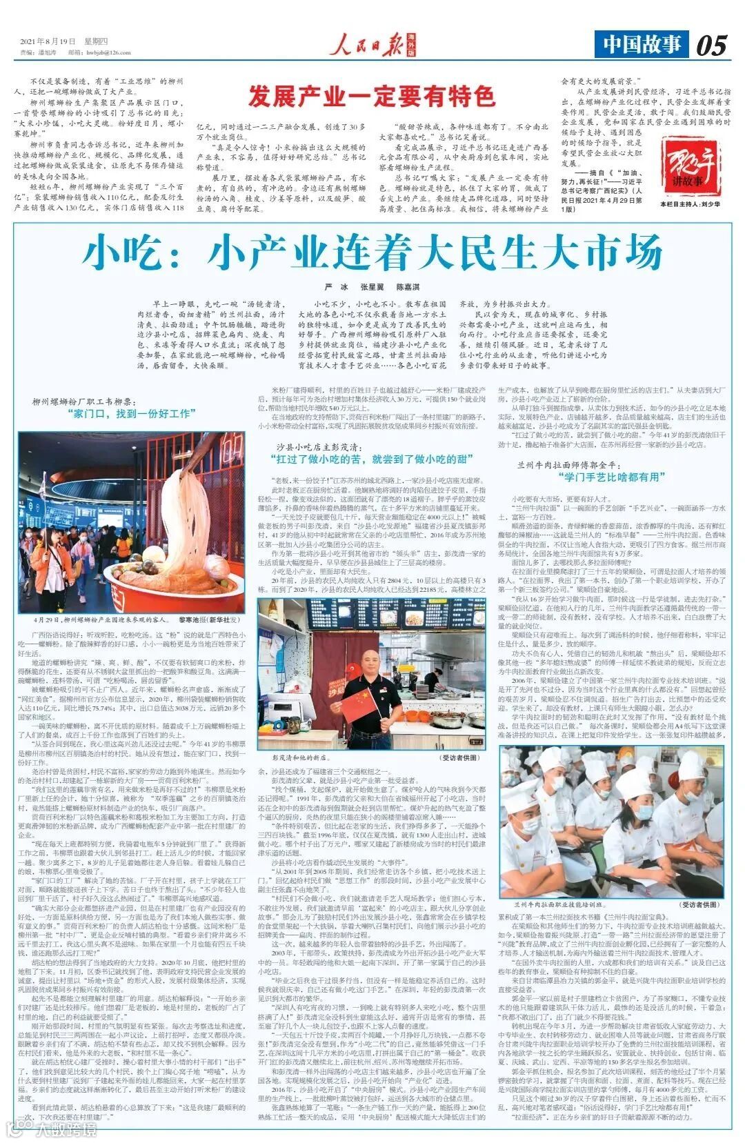 8月19日,《人民日报》(海外版)刊发《发展产业一定要有特色(习近平讲故事)》和《小吃:小产业连着大民生大市场》,讲述柳州螺蛳粉产业发展的故事。