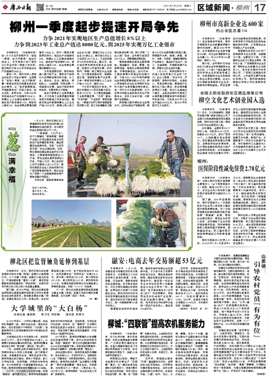 1月20日,《广西日报》整版报道柳州。其中头条刊发《柳州一季度起步提速开局争先/力争2021年实现地区生产总值增长8%以上》,报道了柳州力争到2023年工业总产值达8000亿元,到2025年实现万亿工业强市。