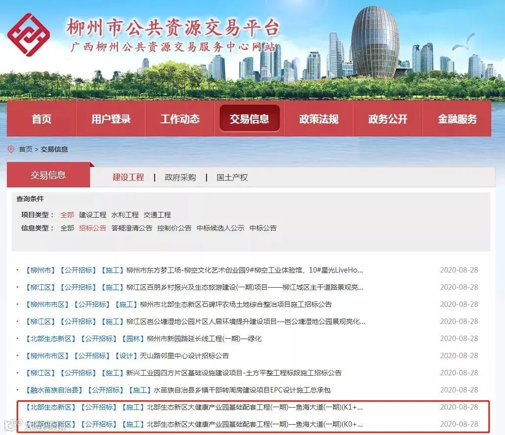8月28日,广西柳州市公共资源交易服务中心网站发布公告,对北部生态新区大健康产业园基础配套工程(一期)工程施工进行招投标。该工程共计7条道路,包括鱼海大道(一期)、沙塘大道(一期)、德崇路(一期)、齐信路、斜江路、上等路、保艾路。
