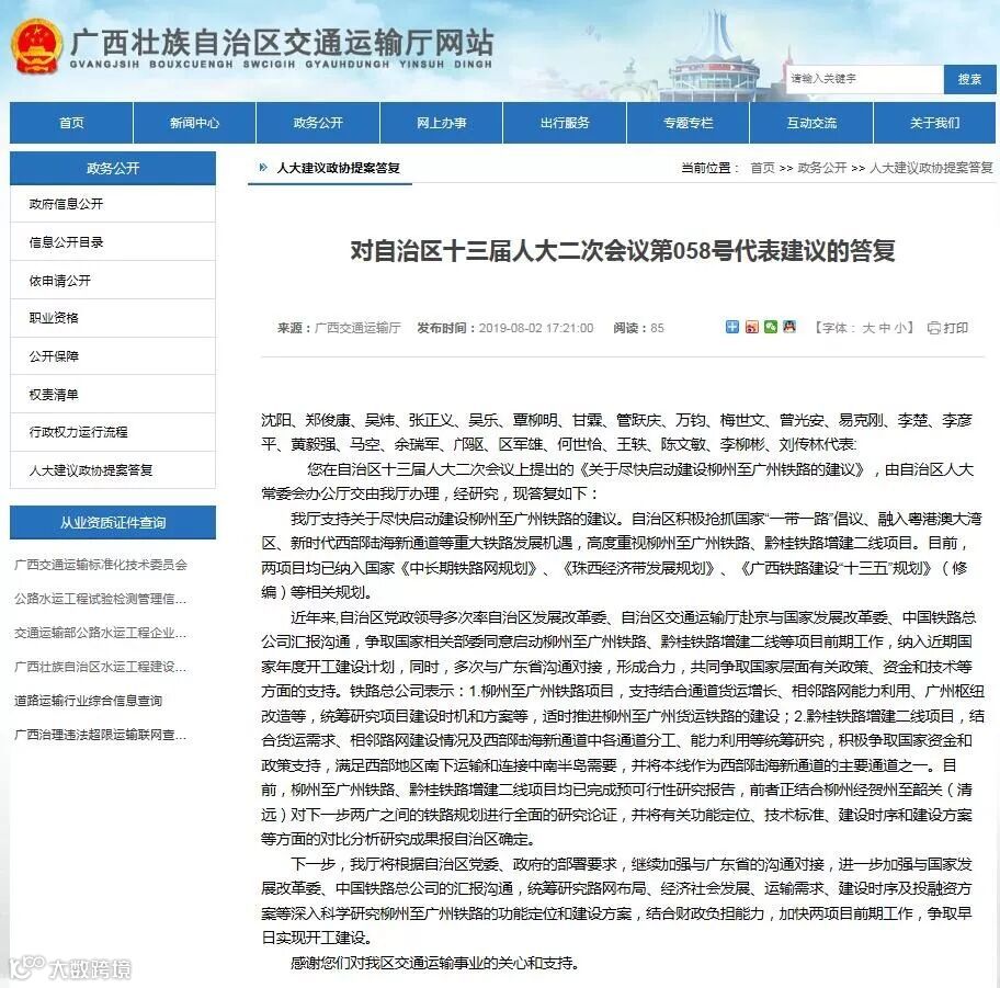 8月2日,据《对自治区十三届人大二次会议第058号代表建议的答复》,广西交通运输厅支持关于尽快启动建设柳州至广州铁路的建议。广西积极抢抓国家“一带一路”倡议、融入粤港澳大湾区、新时代西部陆海新通道等重大铁路发展机遇,高度重视柳州至广州铁路、黔桂铁路增建二线项目。目前,两项目均已纳入国家《中长期铁路网规划》《珠西经济带发展规划》《广西铁路建设“十三五”规划》(修编)等相关规划。