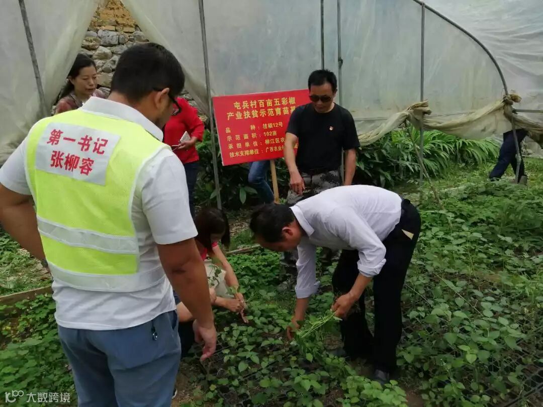 市投资促进局重点帮扶产业项目,2018年自治区扶持村级集体经济发展试点项目——屯兵村五彩泡椒加基地项目得到了柳州市各级领导的肯定,也在市级媒体广泛宣传。融水县安陲乡江门村第一书记张柳容得知消息后,主动联系市投资促进局派驻屯兵村第一书记刘伟伟,希望组团到屯兵村考察学习考察产业发展、村集体经济收入、贫困户贫困村脱贫摘帽措施等经验。5月13日安陲乡考察团终于成行了,融水县安陲乡脱贫攻坚(乡村振兴)工作分队队长吴哲、乡党委委员纪委书记杨娟、乡党委组织委员李翔、安陲乡江门村第一书记张柳容等一行16人来到土博镇屯兵村。