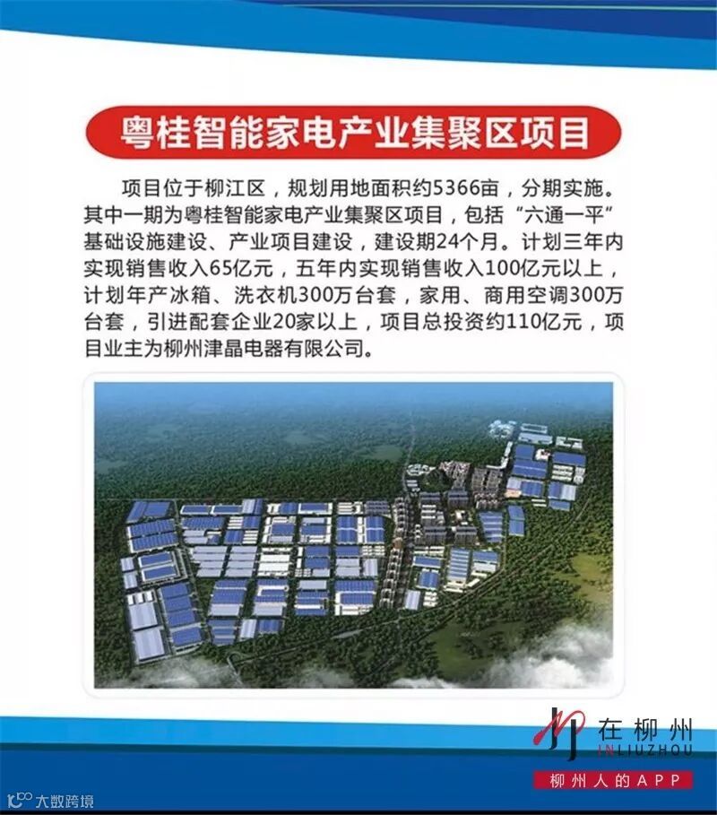 项目位于柳江区,规划用地面积约5366亩,分期实施。其中一期为粤桂智能家电产业集聚区项目,包括“六通一平”基础设施建设、产业项目建设,建设期24个月。计划三年内实现销售收入65亿元,五年内实现销售收入100亿元以上,计划年产冰箱、洗衣机300万台套,家用、商用空调300万台套,引进配套企业20家以上,项目总投资约110亿元,项目业主为柳州津晶电器有限公司。