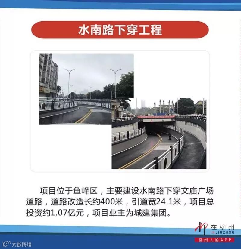 项目位于鱼峰区,主要建设水南路下穿文庙广场道路,道路改造长约400米,引道宽24.1米,项目总投资约1.07亿元,项目业主为城建集团。