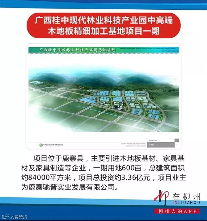 项目位于鹿寨县,主要引进木地板基材、家具基材及家具制造等企业,一期用地600亩,总建筑面积约84000平方米,项目总投资约3.36亿元,项目业主为鹿寨驰普实业发展有限公司。