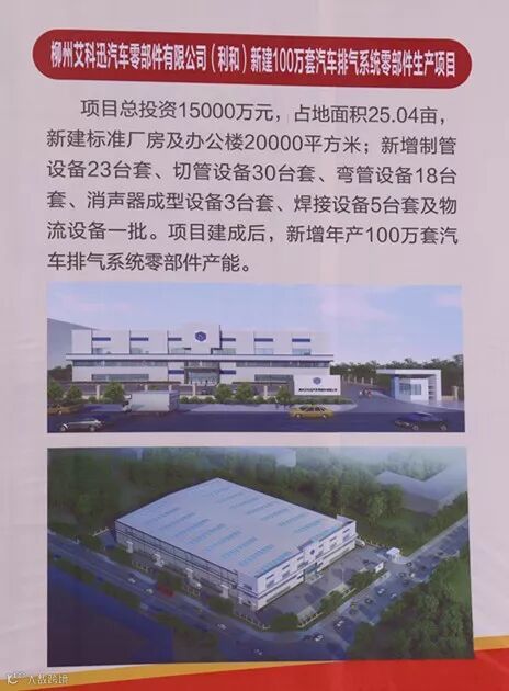 在柳州市柳东新区花岭片区C-16-3地块拟购地25.04亩,新建标准厂房及办公楼20000平方米;新增制管设备23台套、切管设备30台套、弯管设备18台套、消声器成型设备3台套、焊接设备5台套及物流设备一批。项目建成后,新增年产100万套汽车排气系统零部件产能。