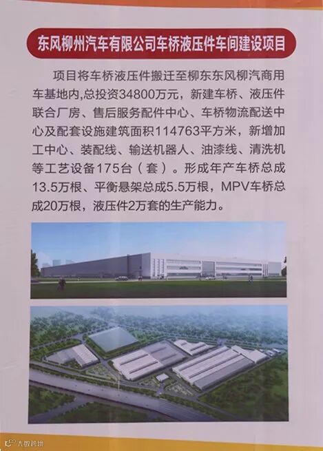 将车桥液压件搬迁至柳东东风柳汽商用车基地内,新建车桥、液压件联合厂房、售后服务配件中心、车桥物流配送中心及配套设施建筑面积114,763㎡,新增加工中心、装配线、输送机器人、油漆线、清洗机等工艺设备175台(套)。形成年产车桥总成13.5万根、平衡悬架总成5.5万根,MPV车桥总成20万根,液压件2万套的生产能力。