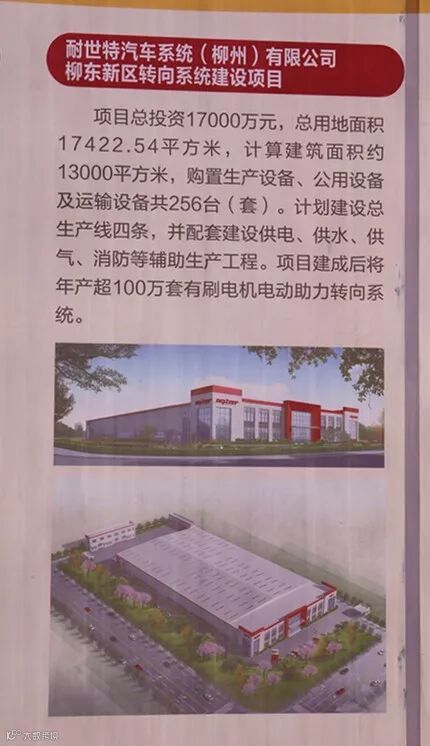 项目总用地面积17422.54平方米,计算建筑面积约13000平方米,购置生产设备、公用设备及运输设备共256台(套)。计划建设总生产线四条,并配套建设供电、供水、供气、消防等辅助生产工程。项目建成后将年产超100万套有刷电机电动助力转向系统,主要销售给耐世特汽车系统(柳州)有限公司目前在柳州的两大汽车客户:上汽通用五菱和东风柳汽,今后可能获得的西南地区的整车客户的采购业务。