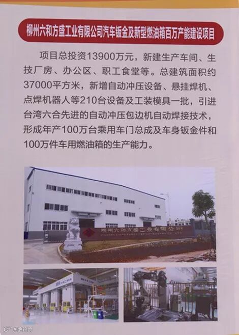 新建生产车间、生技厂房、办公区、职工食堂等,总建筑面积约37000平方米,新增自动冲压设备、悬挂焊机、点焊机器人等210台设备及工装模具一批,引进台湾六和先进的自动冲压包边及自动焊接技术,形成年产100万台套乘用车门总成及车身钣金件和100万件车用燃油箱的生产能力。