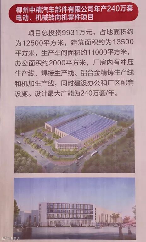 柳州中精汽车部件有限公司年产240万套电动、机械转向机零件项目 新建占地面积约为12500平方米的一座生产厂房,建筑面积约为13500平方米,生产车间面积约11000平方米、办公面积约2000平方米,厂房内有冲压生产线、焊接生产线、铝合金精铸生产线和机加生产线,同时建设办公和厂区配套设施。设计最大产能为240万套/年。