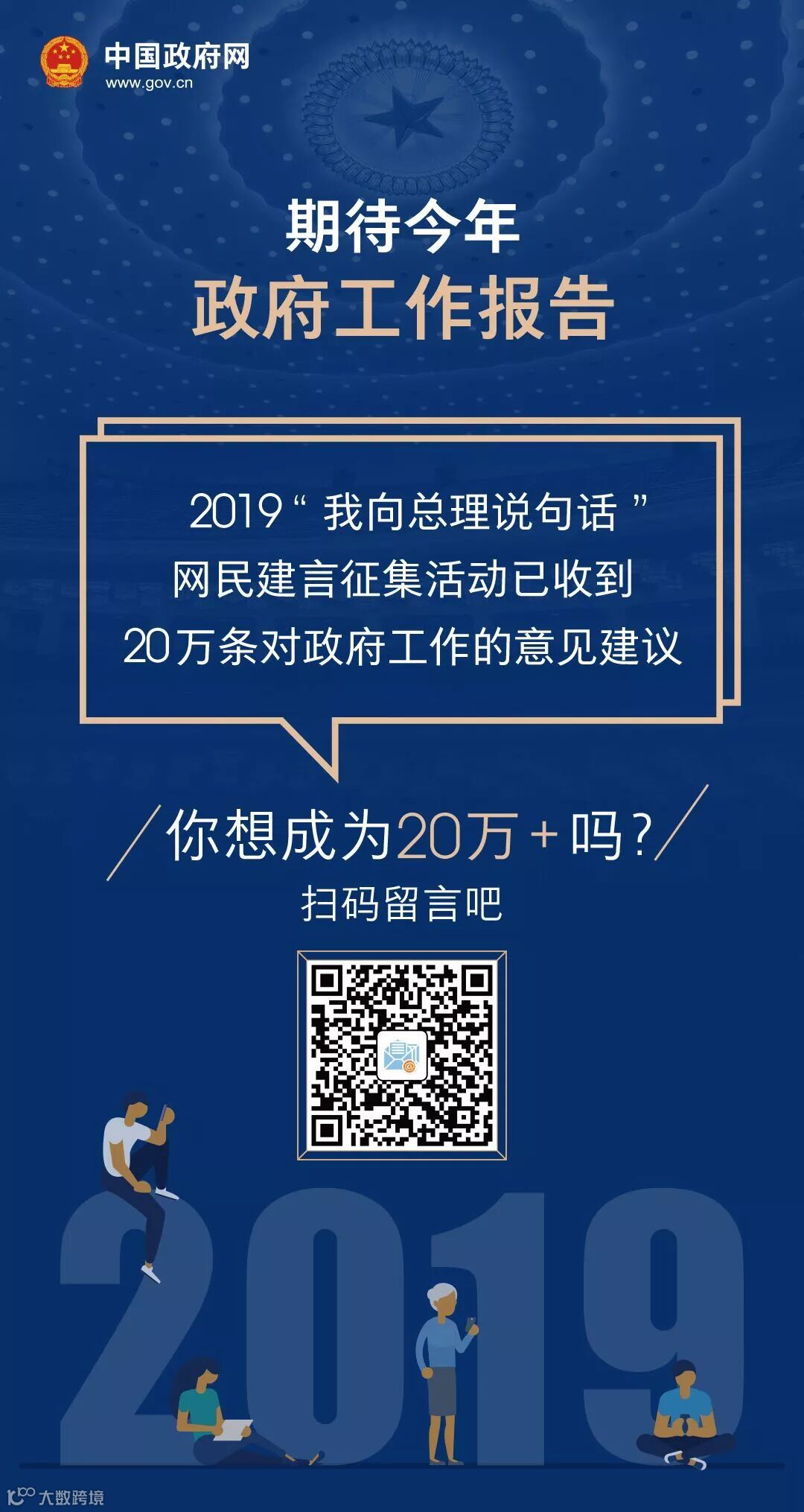 2019“我向总理说句话”网民建言征集活动留言已突破20万条。识别上方二维码参与活动,为政府工作提意见建议。