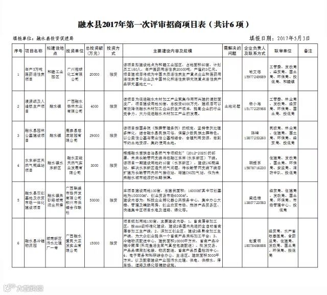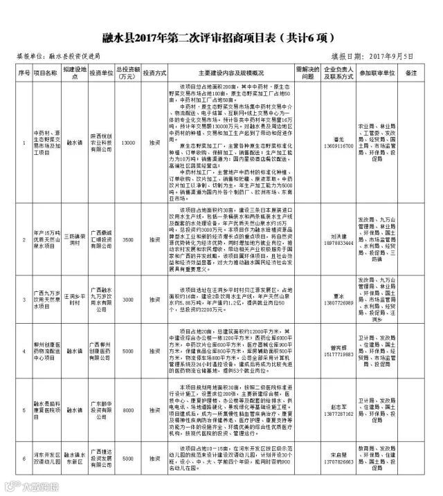 围绕建设生态县目标,开展有针对性的招商,拒绝高耗能、有污染的项目落户。今年组织了两次项目联评联审,第一次联评会上报的6个项目6个获得评审通过,分别是双创基地及农贸市场一体化建设项目、水东新区天然气瓶组站项目、禽畜深加工冷链物流园项目、园林公墓建设项目、年产5万吨医药活性炭项目、浸质纸和生态板项目。第二次联评会上报项目6个,6个项目全部通过,同意引进,分别是中药材、源生态野菜交易市场及加工项目、年产15万吨优质天然山泉水项目、广西九万岁饮用天然泉水项目、柳州创康医药物流配送中心项目、融水县脑科康复医院项目、水东新区双语幼儿园项目。
