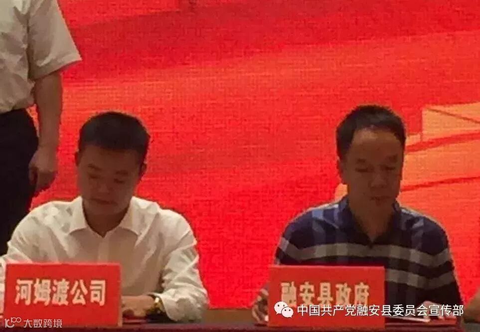 融安县副县长黄国华(右)与广西河姆渡投资集团有限公司负责人(左)签订协议
